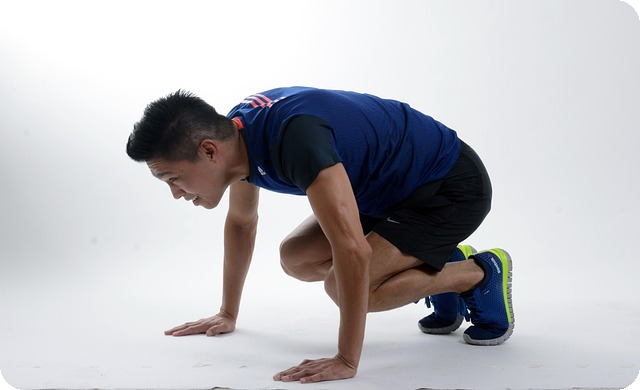 - 스쿼트 자세에서 시작합니다.
